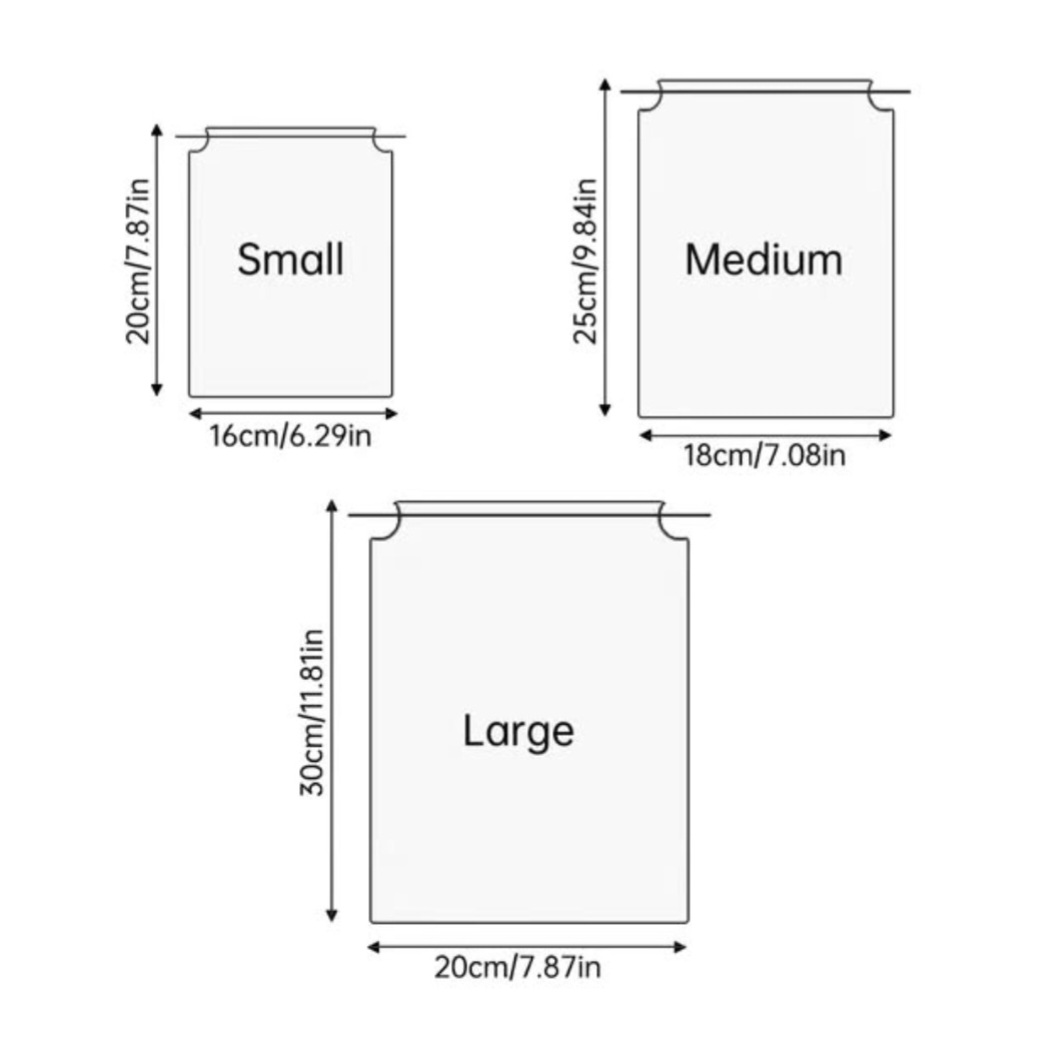 ابعاد محصول شامل سایز های خیلی بزرگ (۳۰ × ۳۵ سانتی متر)، بزرگ (۲۰ × ۳۰ سانتی متر)، متوسط (۱۸ × ۲۵ سانتی متر) و کوچک (۱۶ × ۲۰ سانتی متر) است. جنس محصول pvc یا پلاستیک نرم است.