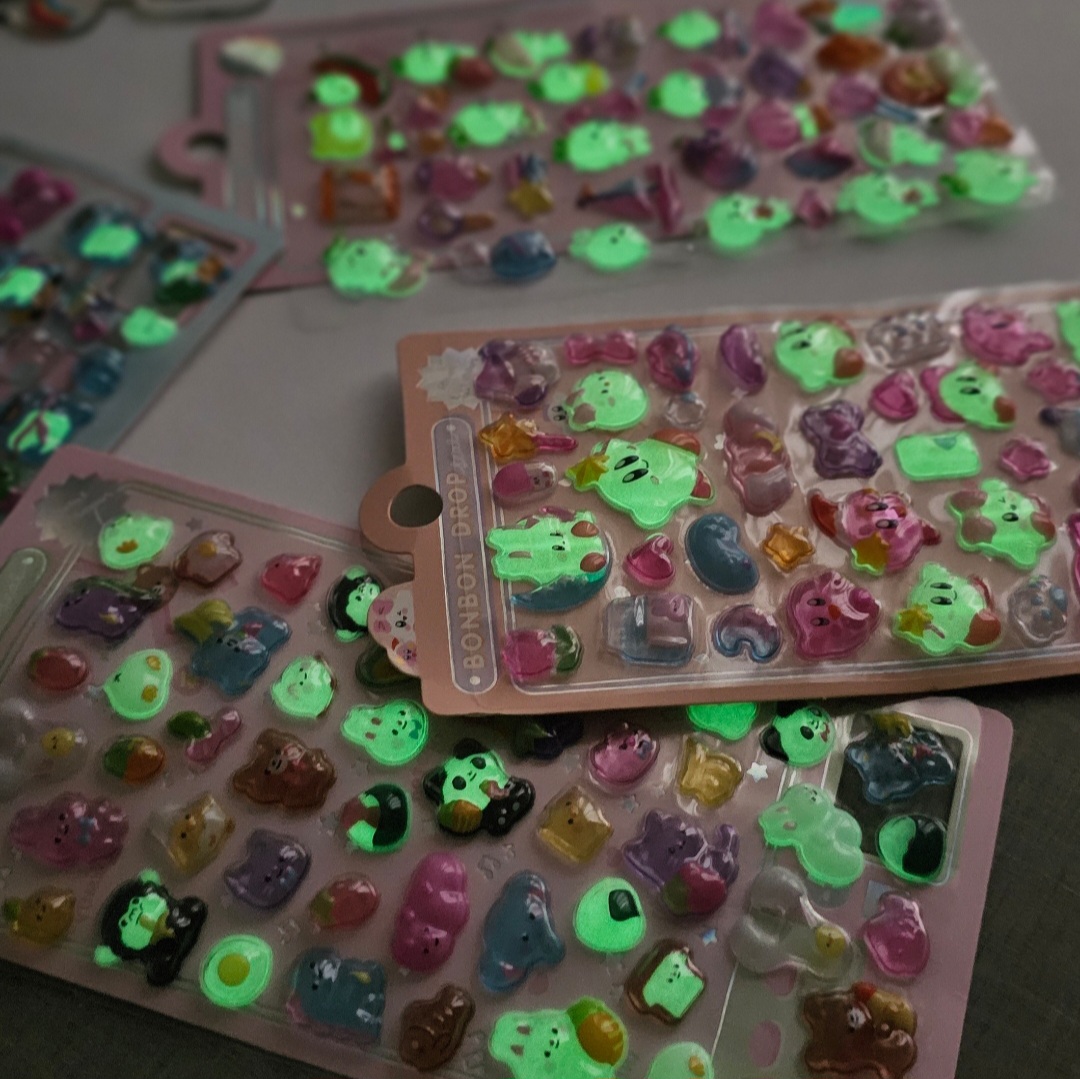 این استیکرها شیشه ای هستن و به هر سطحی قابل اتصال هستن 🍒 از طرفی شب تاب هم هستن🍒 کافیه توی روز بهشون نور برسه تا توی تاریکی نور سبز ساطع کنن 🍒